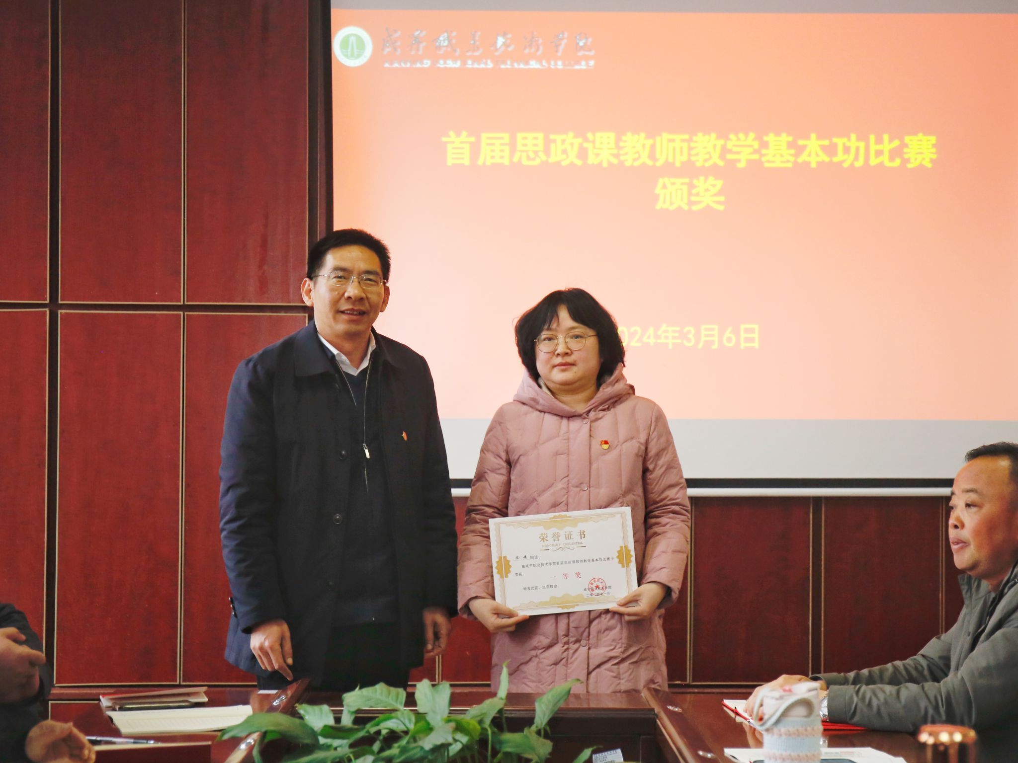 公司党委书记高焕清给二等奖获得者张芬老师颁发证书